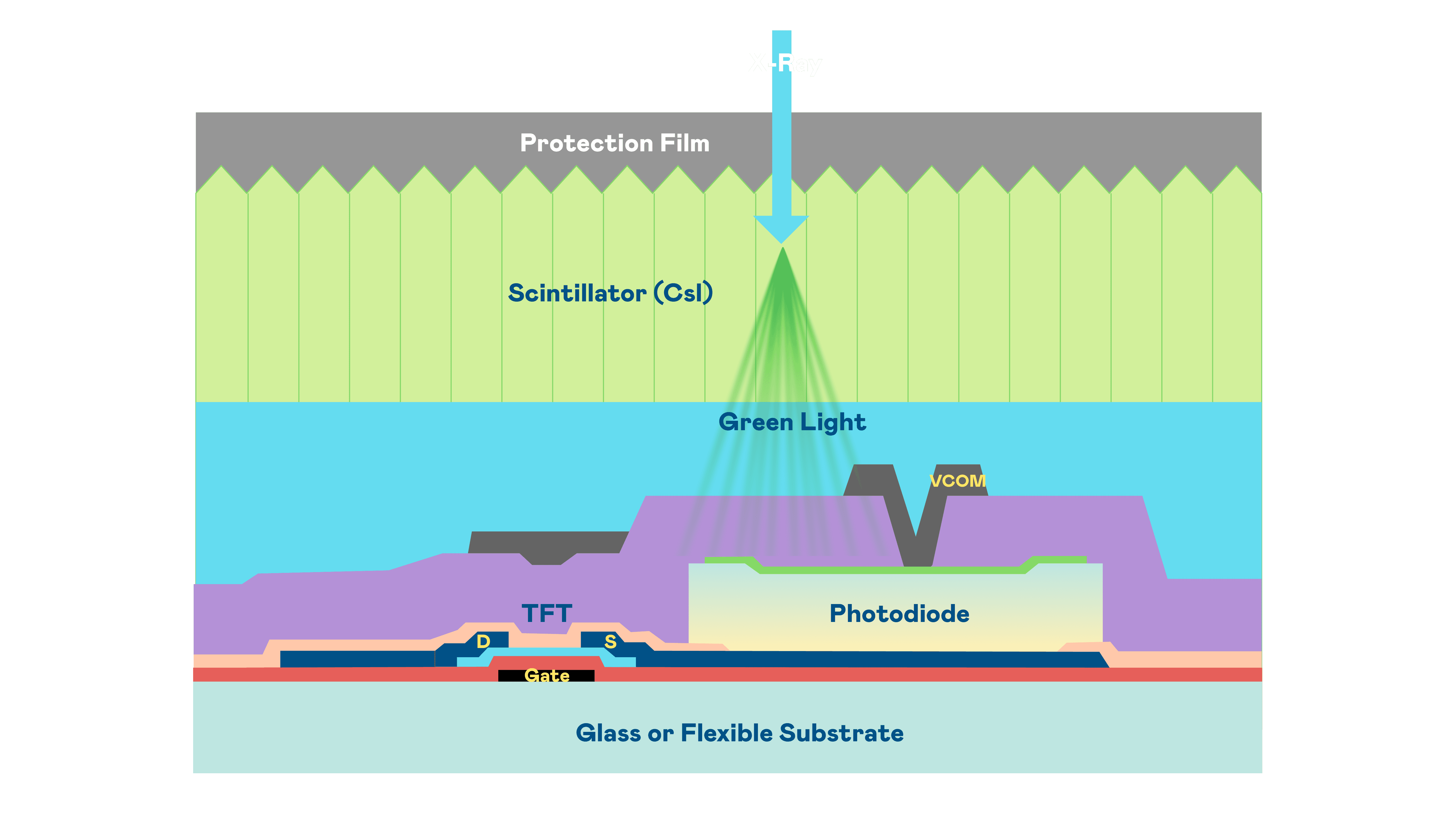 尊龙集团的X光影像感测阵列使用薄膜电晶体 (TFT) 作为每个像素的读取开关,,搭配光电二极体(Photodiode)的光电转换元件,,,用以感测X光影像讯号。。。