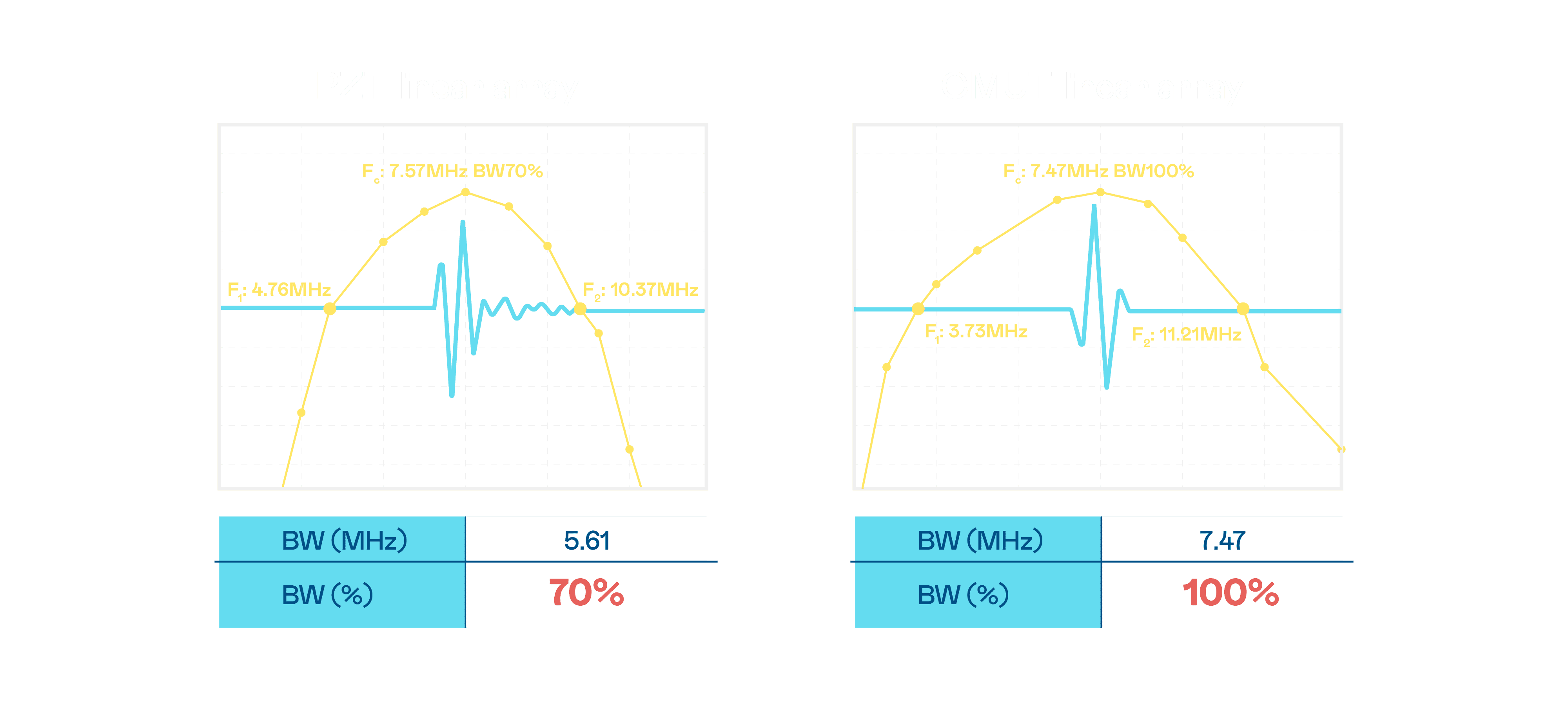 超音波影像的解析度高低,,,,首先取决于探头能发出的讯号频宽。。。。尊龙集团 CMUT 可提供高清晰的超音波讯号,,,,提供高频宽、、、高灵敏度、、、影像纹理细节更高的超音波影像,,协助医护人员缩短影像判读时间及利用精准的医疗影像进行诊断。。。。